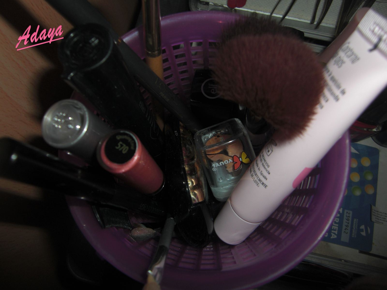 En este tupper enorme, que venía de regalo con los yogures, guardo el resto. La verdad que es un recipiente muy cómodo gracias a la tapa con bisagras. Aquí guardo las bases, los correctores, el iluminador, los polvos compactos, los polvos bronceadores, los rimmeles, lápices de ojos, eyeliner líquidos, lápices de labios, la kabuki (para que no coja polvo), la brocha para maquillaje líquido, la brocha que venía con los polvos de sol, esponjitas de latex y una borla.